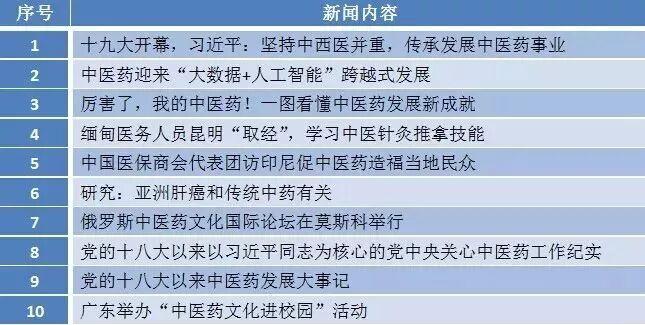 作者:朱蕗鋆 来源:中国中医药报 上一监测周期(10月14~20日),中国共产党第十九次全国代表大会成为全网舆情关注热点,中医药相关话题备受关注。监测显示,微信平台共发布9151条中医药相关图文消息,总阅读量超过1650万人次。微博平台共推送4470条信息。 转载热度前十的新闻如图: 10月18日,中国共产党第十九次全国代表大会在北京人民大会堂开幕,受到全社会关注和讨论。本周舆情主要分析十九大期间中医药舆情的传播情况。通过网页(不包括微博、微信)分析,本周共有2522条内容同时包含关键词“十九大”和“中医药”,其中新闻有1282条。 从舆论指数看,10月16日,中医药舆情开始呈现上升趋势,18日达到峰值。为迎接十九大胜利召开,各地举办多种中医药活动,包括晚会、知识竞赛、摄影展等,以及梳理近五年来中医药发展成就,引发社会关注。 其中《中国中医药报》文章《旗帜引领中医药振兴发展新航向——党的十八大以来以习近平同志为核心的党中央关心中医药工作纪实》和《党的十八大以来中医药发展大事记》引发关注,后一篇文章在微信平台有超过25个公众号转发。 之后,“中国中医”和“中国中医药报”微信推送图文“厉害了,我的中医药!一图看懂中医药发展新成就”,从医疗、教育等多方面展现十八大以来中医药领域取得的成绩。据不完全统计,有62个微信公众号转发此图文,在十九大召开前形成舆论小高峰。 十九大召开当天,在习近平总书记作完报告后,“中国中医”微信第一时间推送图文“十九大开幕,习近平:坚持中西医并重,传承发展中医药事业”,单条阅读量迅速突破10万,截止10月20日,达到20万+阅读量,有354条留言,微信平台转发量达2093条,形成舆论峰值。 通过分析本条微信1.6万字左右的留言内容,得出词云图(如下图),98%以上的留言为积极态度,希望在中西医并重这一方针的指导下,中医药事业会更好地传承发展下去,让中医造福人民健康。同时也有8条留言提到民间中医执业问题,期待配套文件尽快出台。 中国共产党第十九次全国代表大会将对中国未来产生深刻长远影响,习近平总书记在报告中提出的“坚持中西医并重,传承发展中医药事业”为未来中医药发展指明方向。通过舆论关注度和网友留言分析我们发现,无论是中医药新成就的梳理,还是十九大上对中医药的展望,都引起了热烈关注。 从“扶持”到“传承发展”这个新定位、新要求,吹响了中医人新时代征程号角,激励着他们为健康中国去奋斗。就像留言中点赞最多的那条网友留言所说:“热爱中医,从事中医,立志一辈子为中医药事业奋斗终身。运用中西医药为群众解除病痛而努力奋斗!”相信通过中医人的不懈努力,人民离以健康为基础的美好生活也将更近一步。